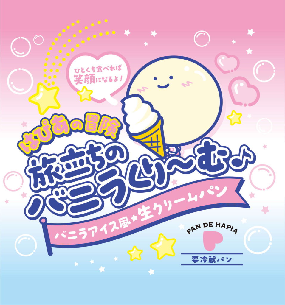 ひとくち頬ばれば、甘い雲に乗って “はぴあ” と旅に出る——そんなワクワクを詰め込んだ 新パッケージ〈はぴあの冒険 旅立ちのバニラくりーむ♪〉 が登場しました。